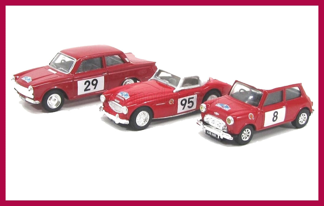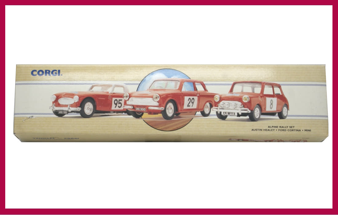 This three car set (Alpine Rally Set) consists of an Austin Healey, Mini Cooper and Ford Cortina MkI all of which made their mark on the rally circuits of the 1960's,