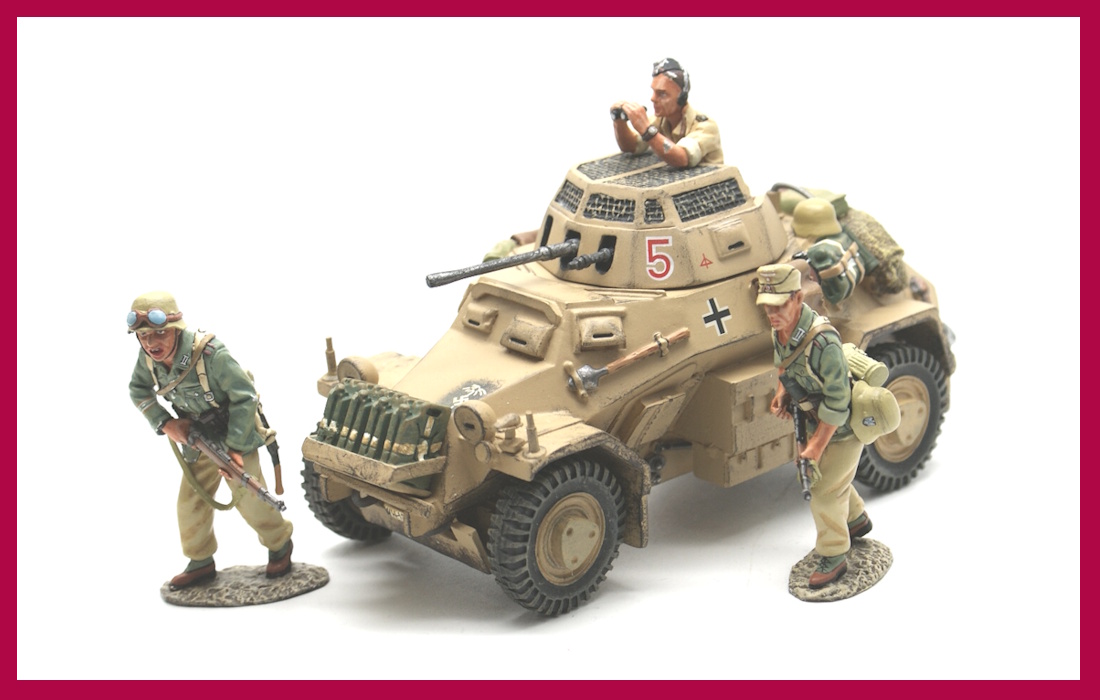 The workhorse of Rommel's reconnaissance squadrons this finely detailed Armoured Car is complete with Commander and two AK Riflemen.